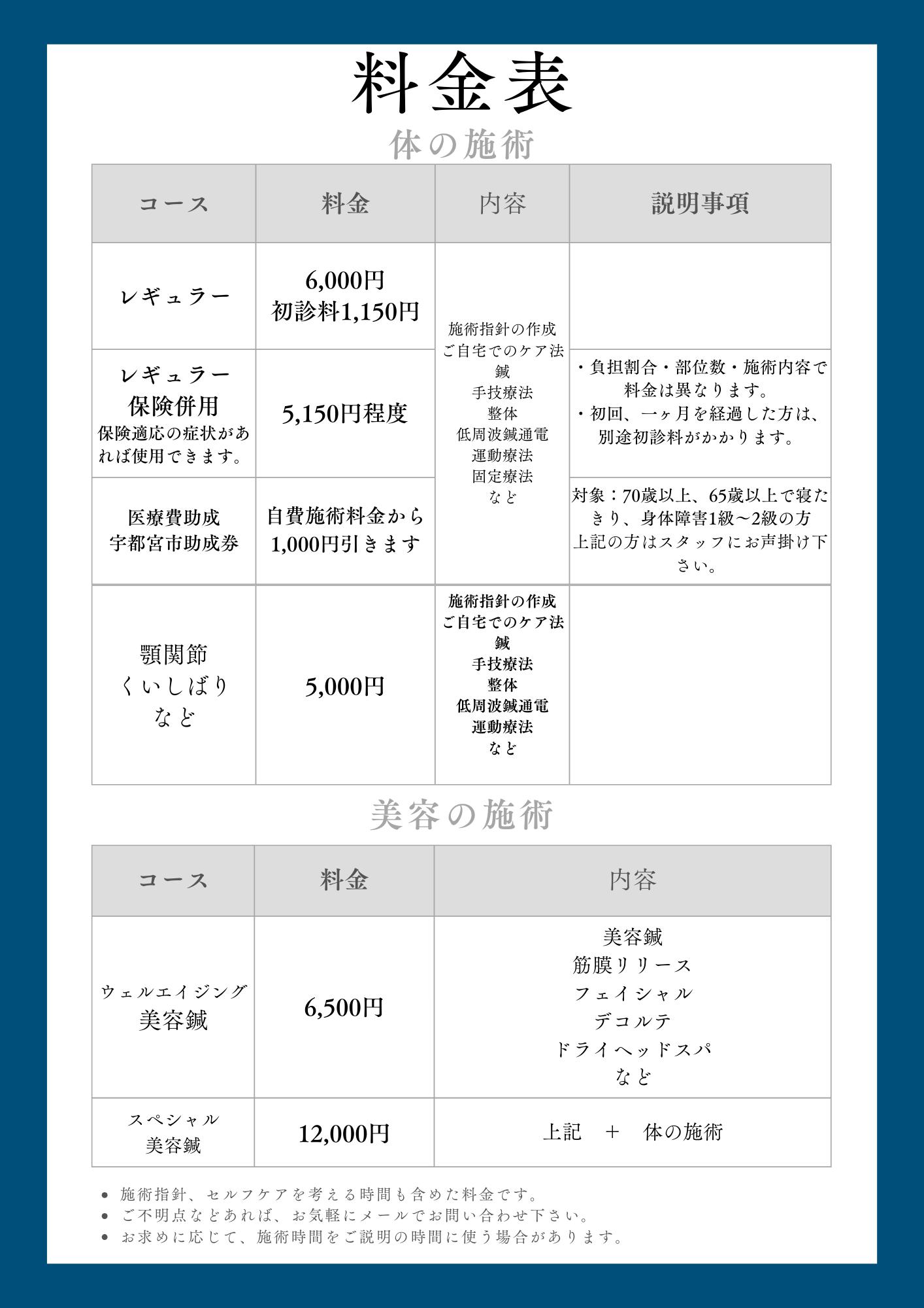 保険適用の症状の場合、約1,000円お安く施術ができます。
